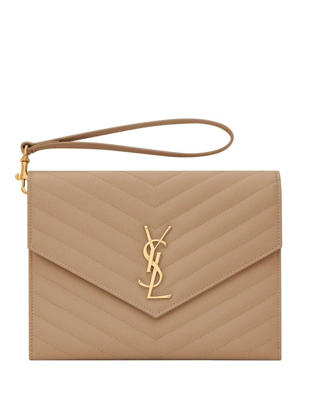 quilted logo-plaque clutch bag from SAINT LAURENT featuring envelope style, wrist strap, signature YSL logo plaque, foldover top with press-stud fastening, camel brown, calfskin, quilted finish and gold-tone hardware.