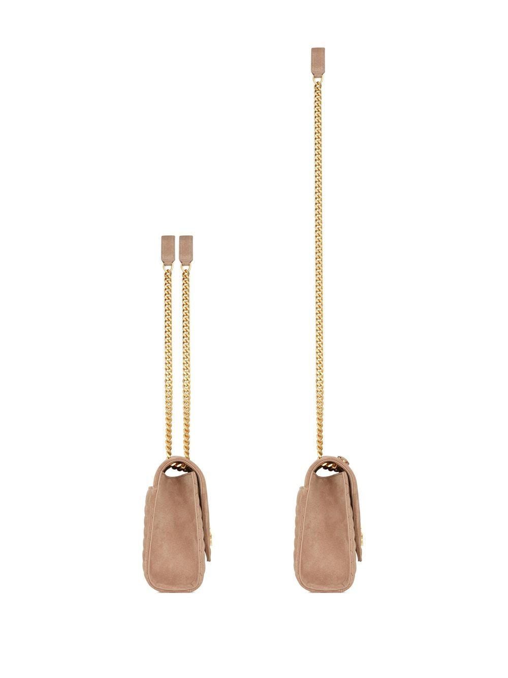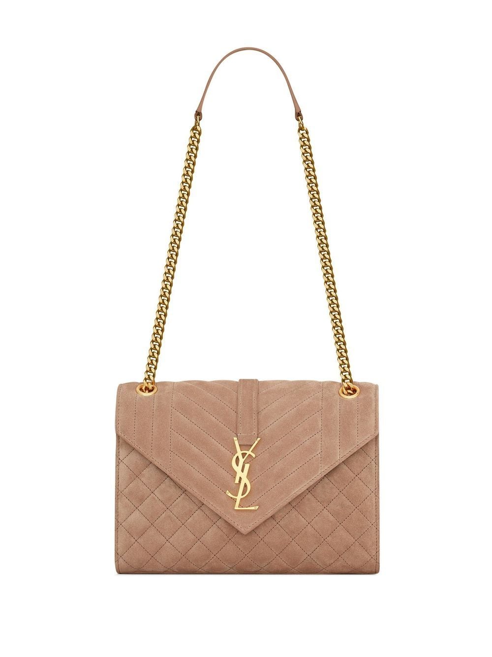 • quilted logo-plaque crossbody bag from SAINT LAURENT featuring rose pink, calf leather, quilted, gold-tone logo plaque, gold-tone hardware, foldover top with magnetic fastening, chain-link shoulder strap and main compartment.
