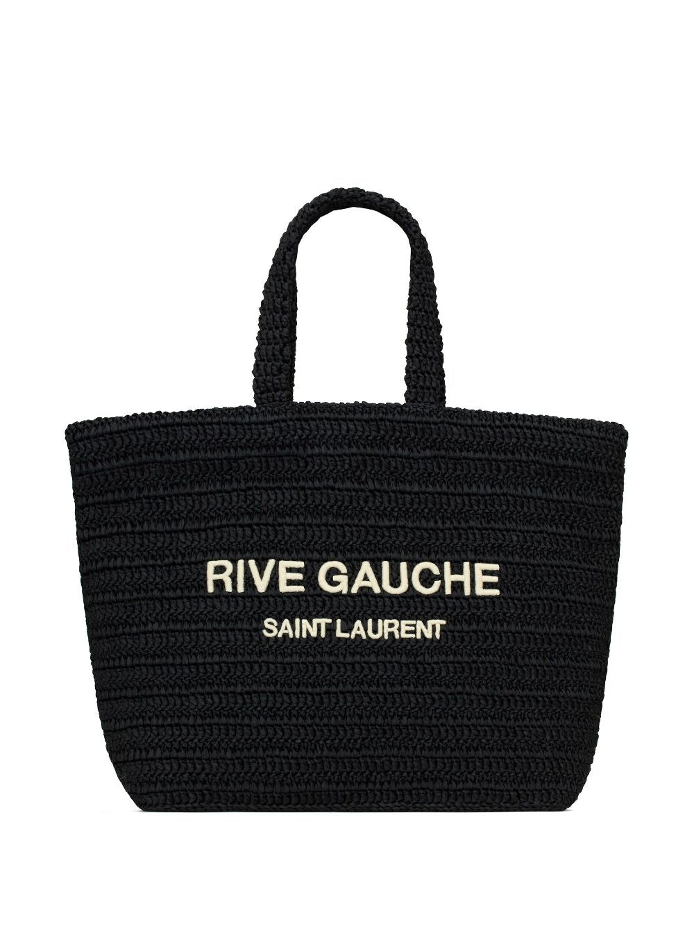 Crafted in a woven raffia design, this Saint Laurent Rive Gauche tote bag is embroidered with a logo on its front. The two-tone style is complete with two long flat top handles and an accessible open-top design.