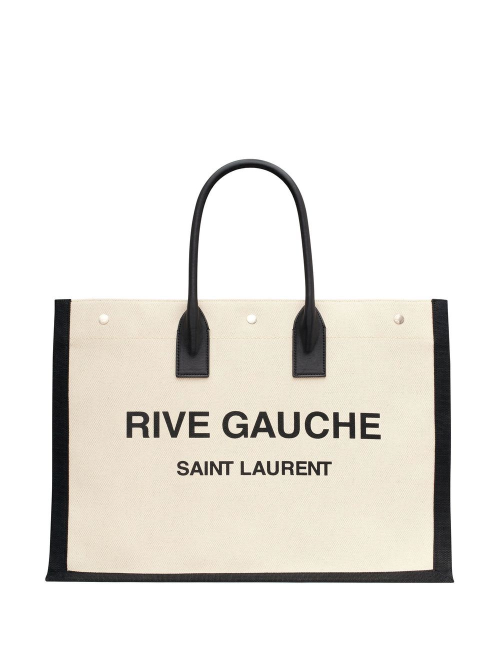 • Rive Gauche tote bag from SAINT LAURENT featuring beige, black, cotton-linen blend, canvas, logo print to the front, leather top handles and main compartment