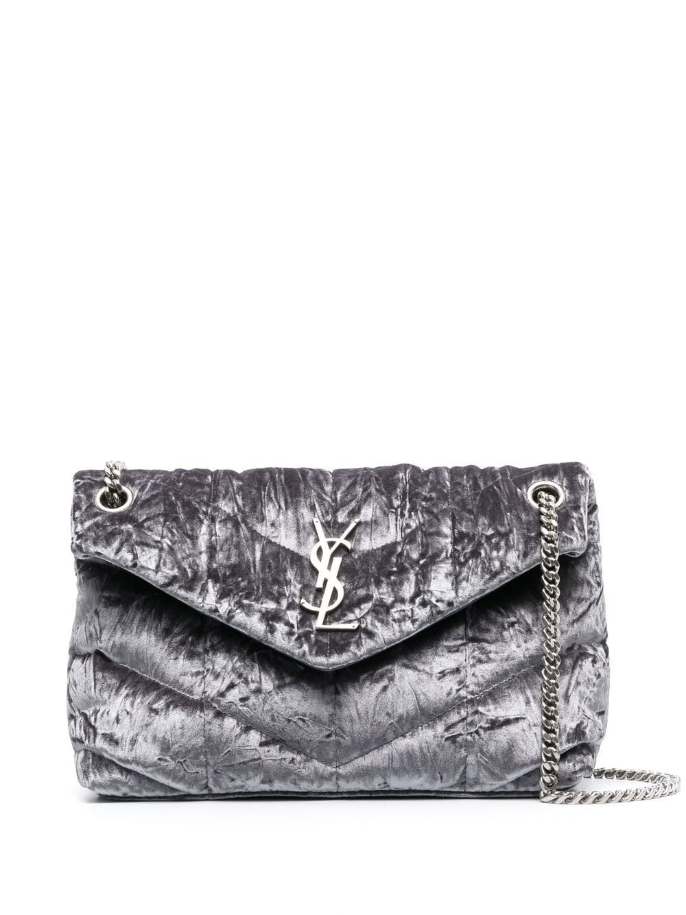 • small Loulou velvet shoulder bag from SAINT LAURENT featuring ash grey, crushed velvet, signature YSL logo plaque, silver-tone hardware, padded design, foldover top, chain-link shoulder strap and main compartment.