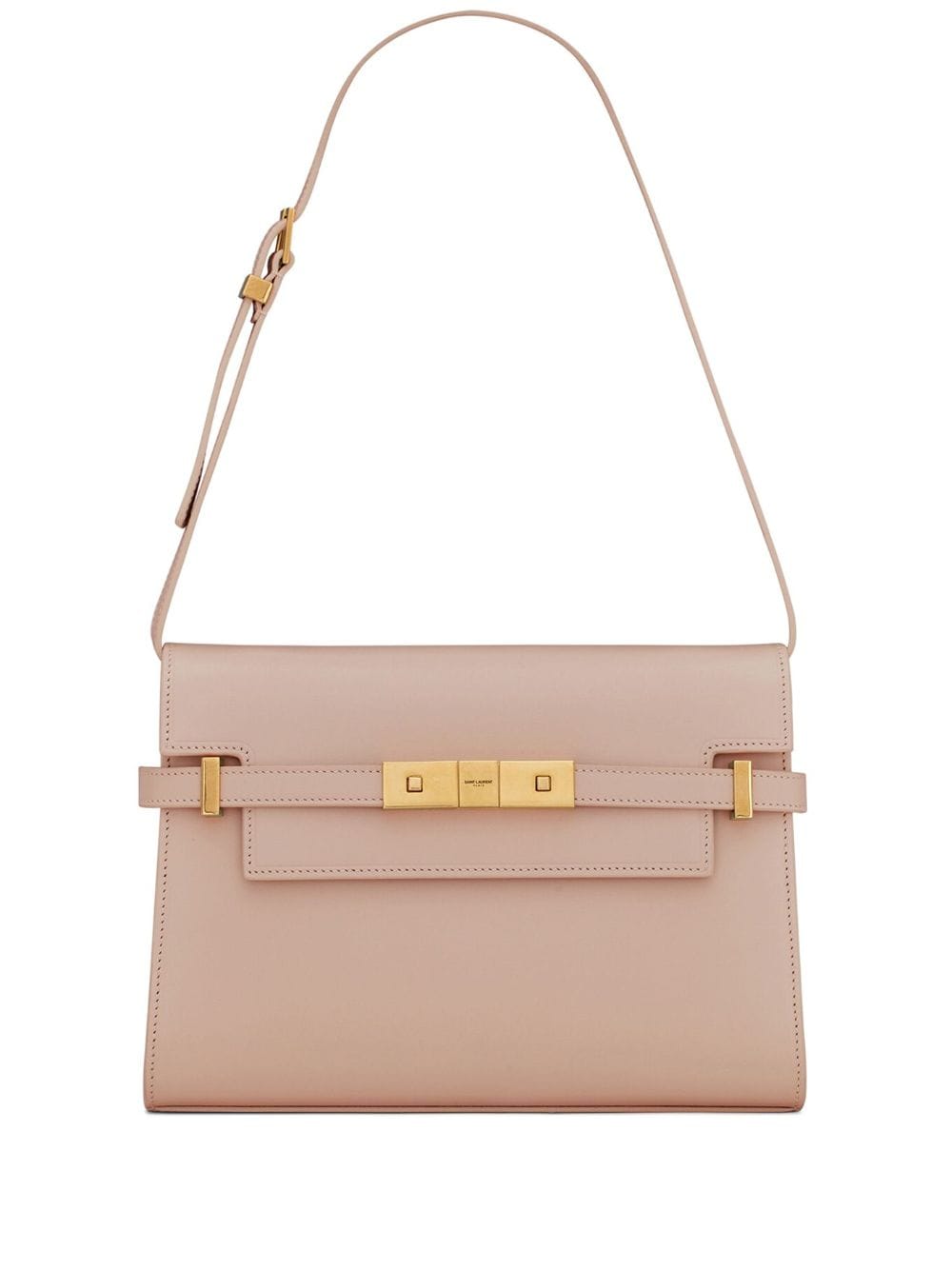 Saint Laurent reimagines its iconic Manhattan shoulder bag for SS23 in a sage-green hue. This small iteration is crafted from smooth leather and punctuated with gold-tone hardware for an inimitable look.