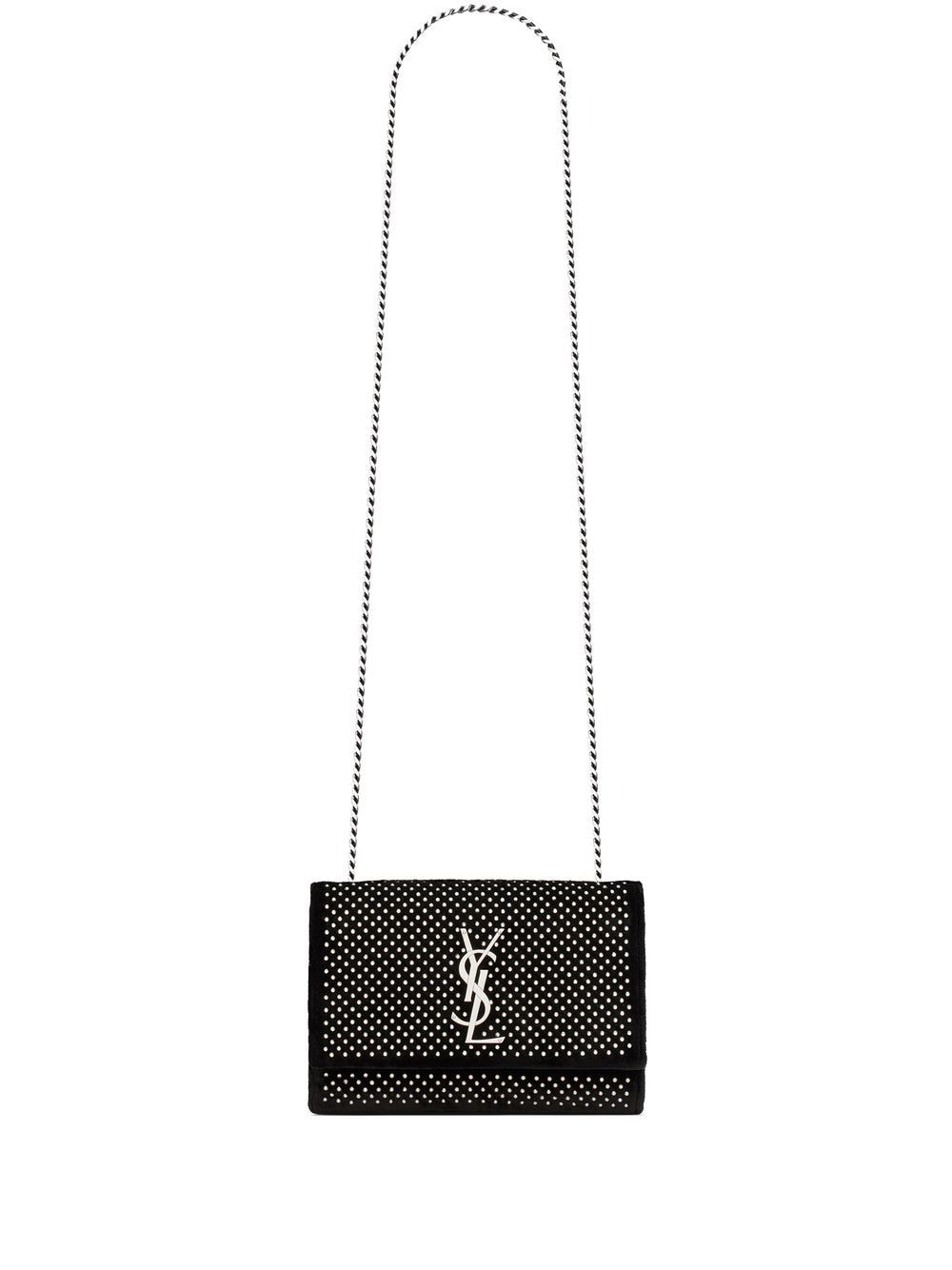 Saint Laurent updates the classic Kate bag this season with a rhinestone-embellished decoration. The signature YSL logo plaque adorns the piece’s front for a classically branded finish.