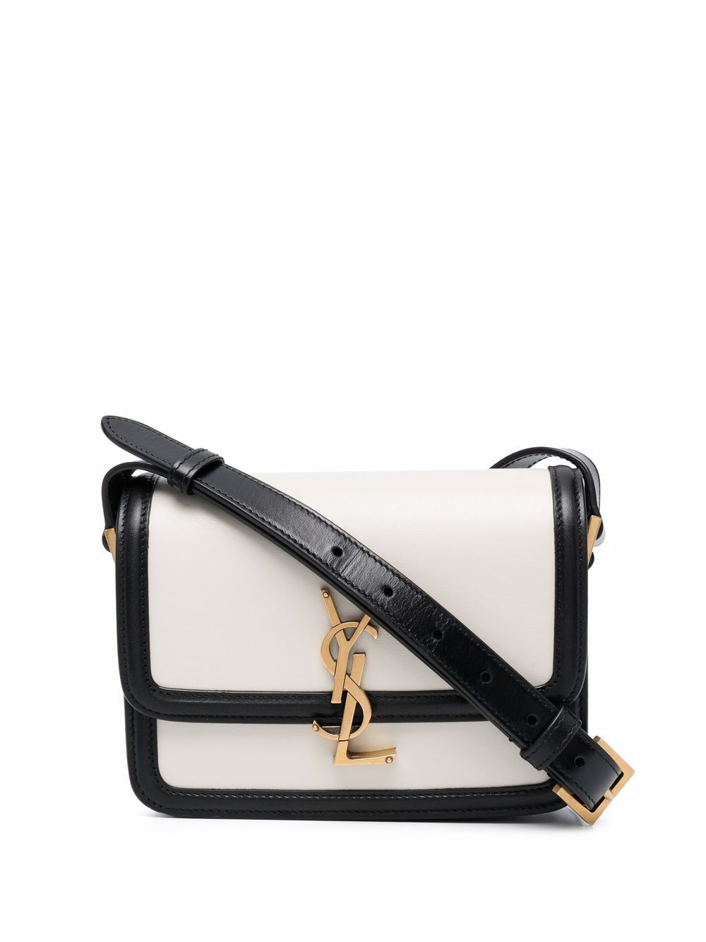 • Revisiting the timeless boxy silhouette, Saint Laurent’s Sunset logo bag makes a refreshing appearance in their SS22 offering. This iteration continues the narrative of the much-coveted accessory, the signature monogram is enhanced by a retro-inspired design and its presented in a cream and black colourway.