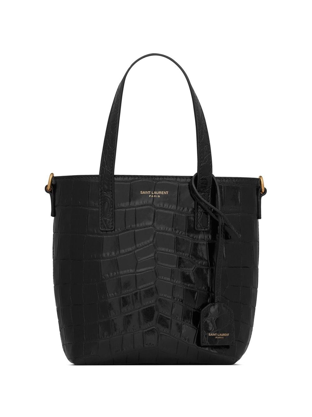 Toy-Shop mini-bag from SAINT LAURENT featuring black, leather, embossed crocodile effect, gold-tone logo lettering, two rounded top handles and adjustable detachable shoulder strap.
