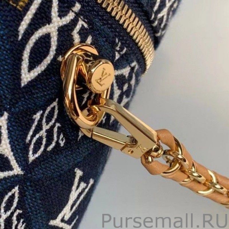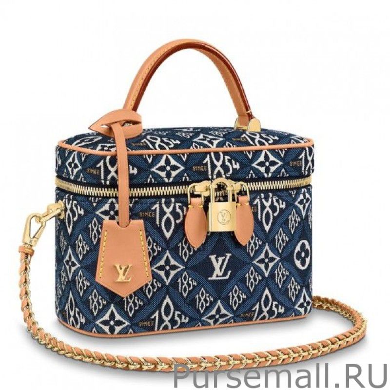 For Spring 2021, Nicolas Ghesquiere crafts the Vanity PM handbag in a vibrant blue Jacquard Since 1854 textile, trimmed with aged natural leather. The pattern combines 1854s, the year of the House founding, with Monogram Flowers. It comfortable to carry by hand and over the shoulder or cross-body thanks to its removable braided-leather chain.