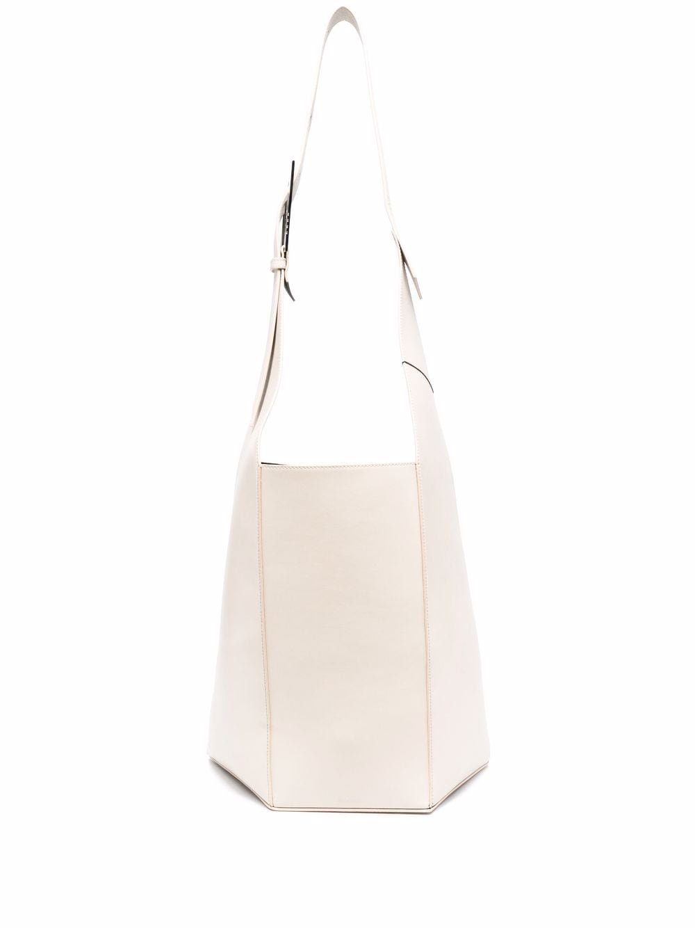 Beige calf leather/cotton 12PM geometric leather tote bag from The Attico featuring geometric frame, logo stamp to the front, removable pouch and adjustable shoulder strap.