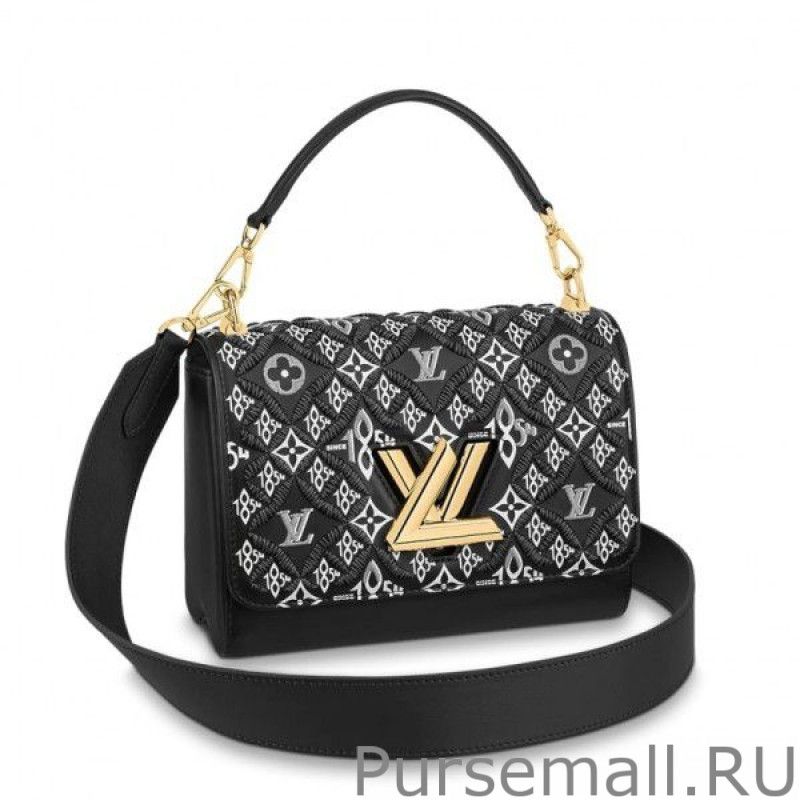 Nicolas Ghesquiere brings his new Since 1854 pattern to the Twist MM handbag, embroidering the motif into the bag supple calfskin. The striking new design, with its LVs and Monogram Blossoms interspersed with 1854s, perfectly complements the bag iconic LV twistlock. The wide removable shoulder strap enables shoulder and crossbody carry.