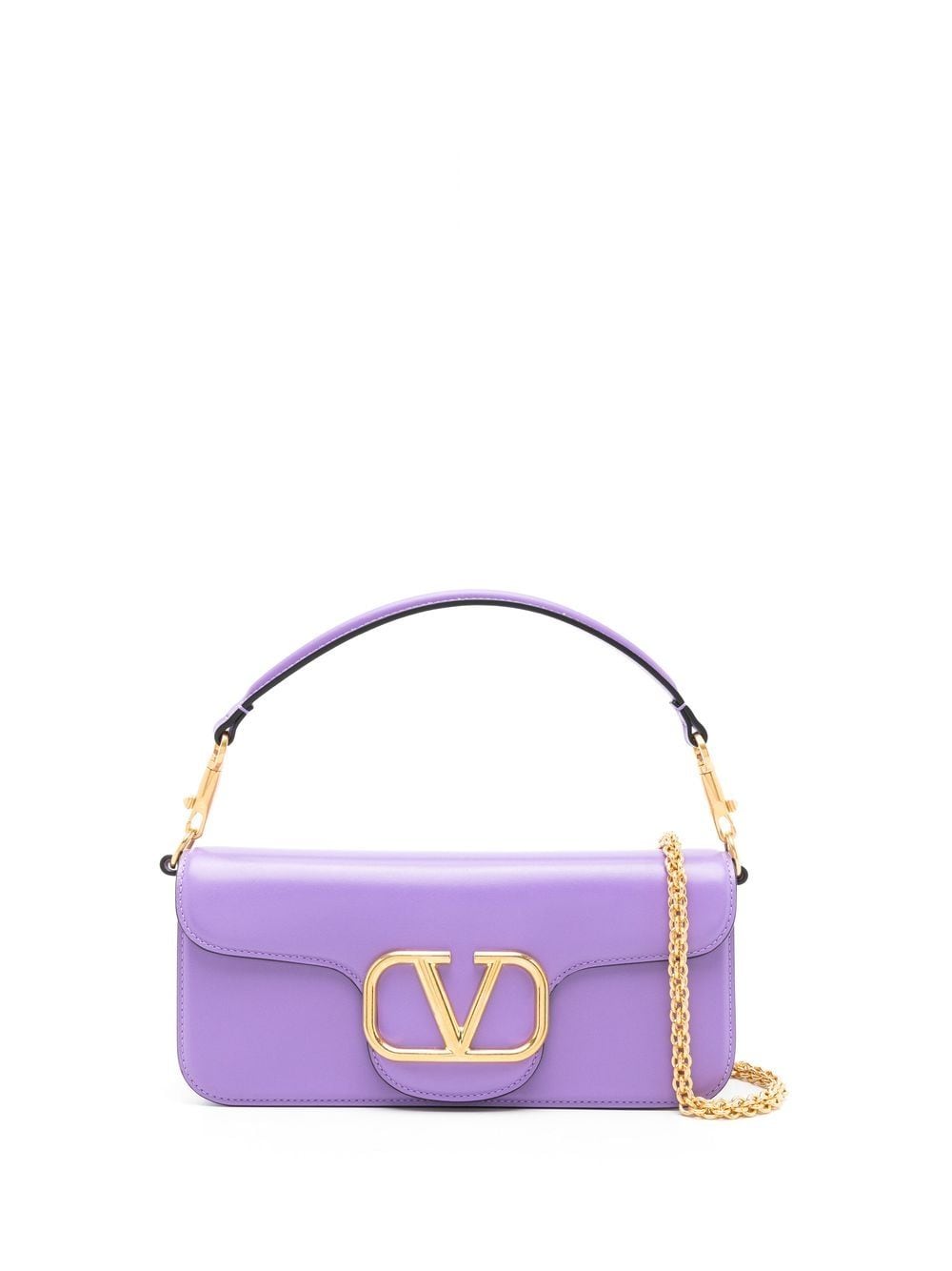 Arriving in a compact leather construction, Valentino Garavani’s Locò bag stands out with the iconic VLogo plaque. Here displayed in a gold-tone, it creates a refined contrast with the violet-hued background.