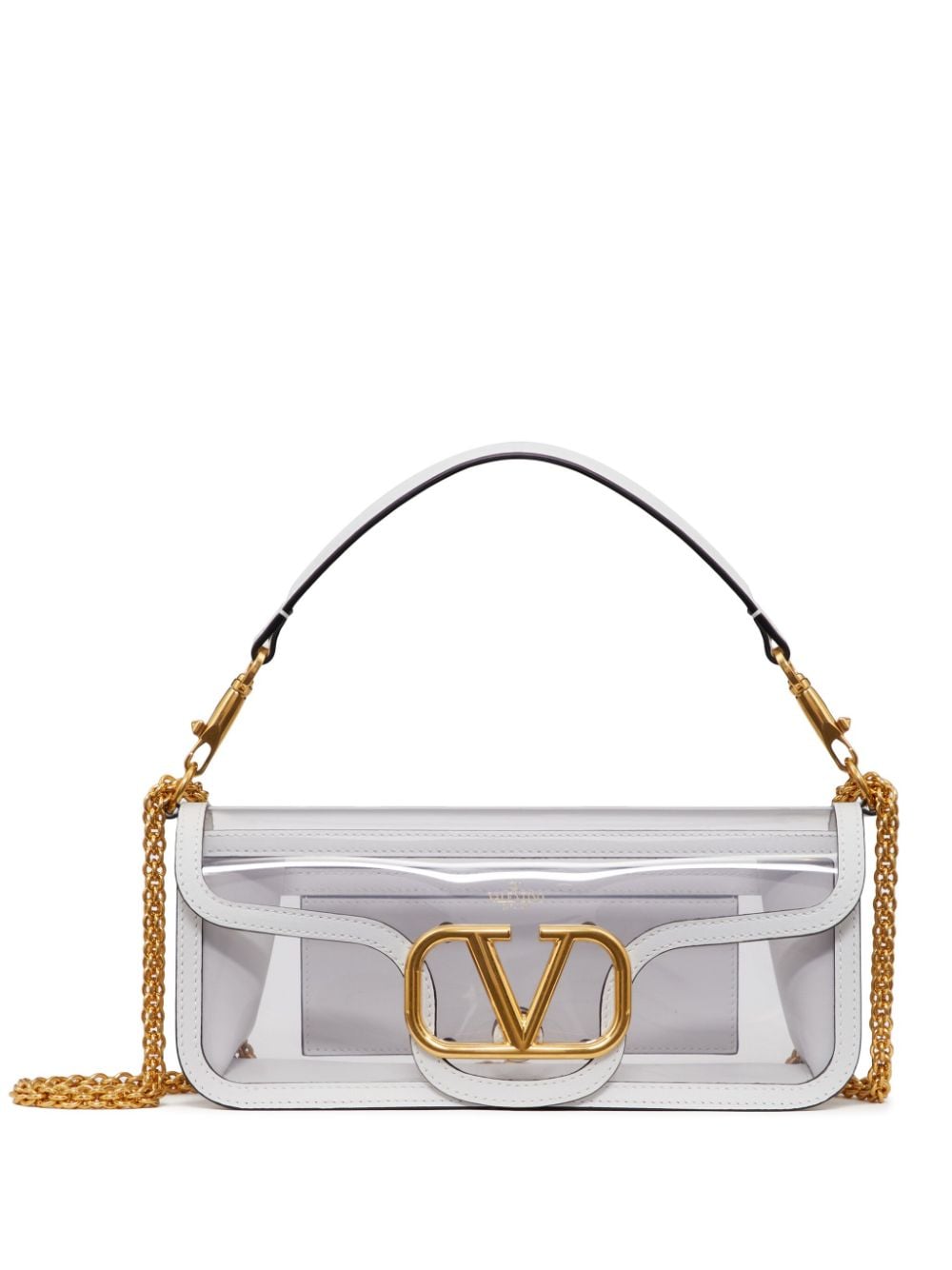 Valentino Garavani’s VLogo Signature is brought back season after season with distinct colours and finishes. In this leather shoulder bag, the detail appears on the front, contrasting with the rest of its transparent design.