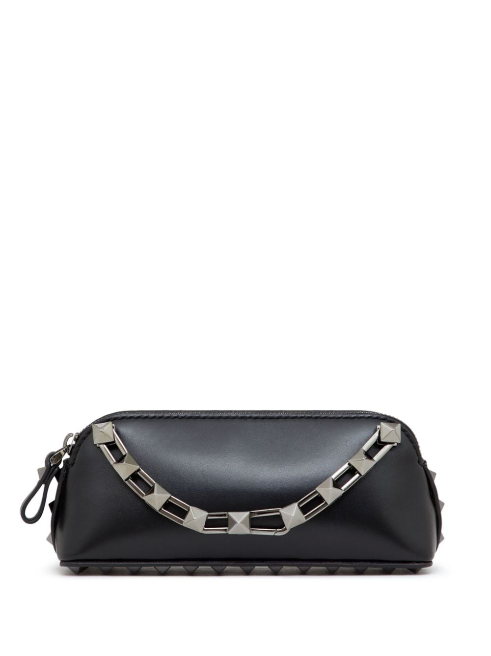 Crafted from smooth black lambskin leather, this triangular mini bag from Valentino Garavani has been adorned with the brand’s signature Rockstud embellishments and a sleek silver-tone chain.