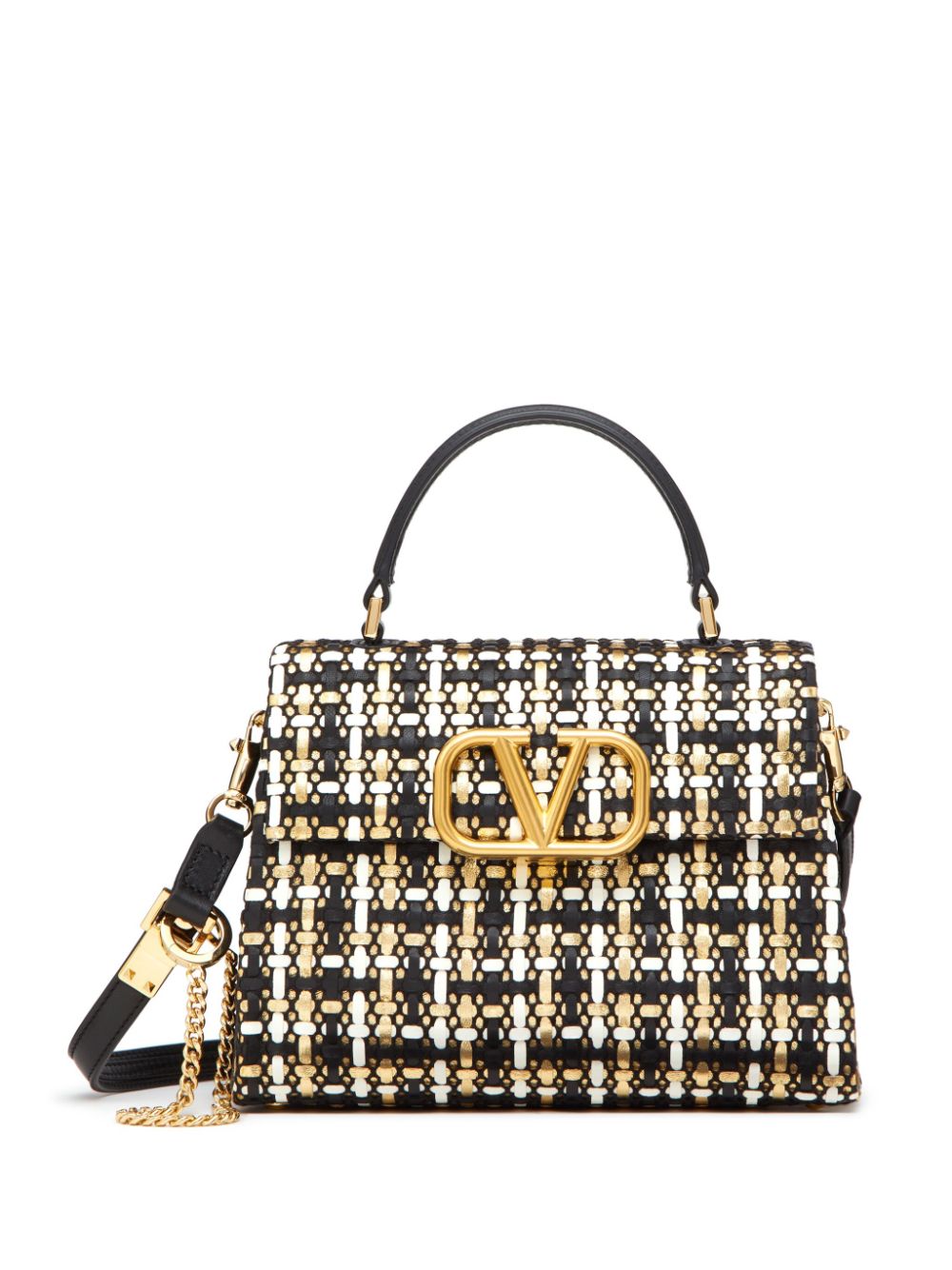Encapsulating all of Valentino Garavani’s refined elegance, this VSling tote bag is defined by shimmering gold-tone embellishments and the VLogo Signature. Crafted with a structured trapeze silhouette, the calf-leather accessory features a detachable shoulder strap for versatile carrying.